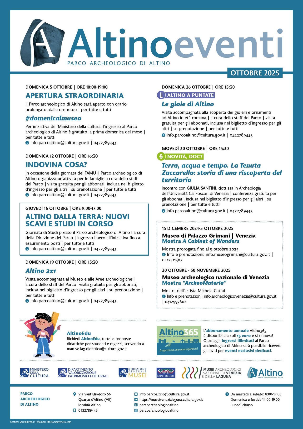 · domenica 27 ottobre, alle 15:30, Le gioie di Altino, visita accompagnata gratuita per gli abbonati, inclusa nel biglietto d’ingresso per gli altri, a cura dello staff del Parco, su prenotazione;