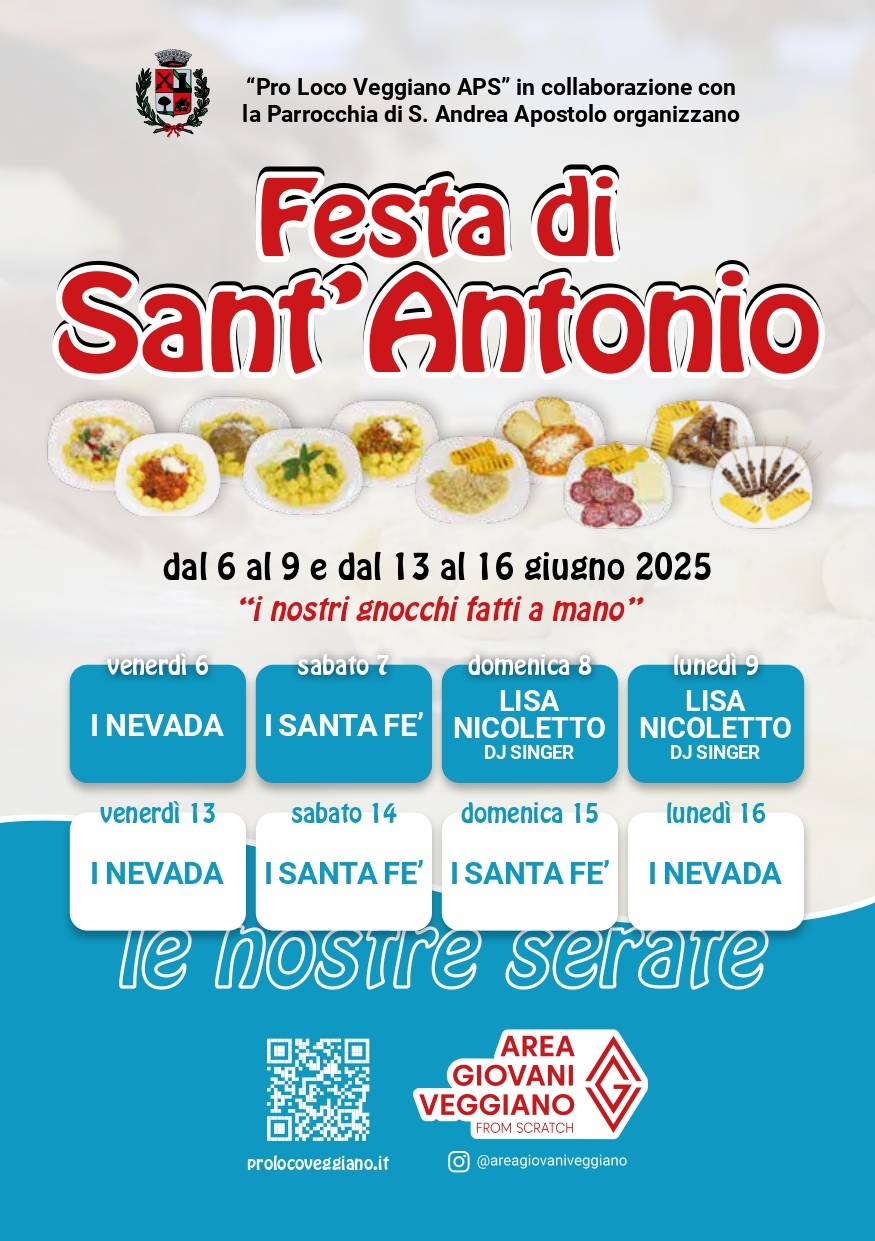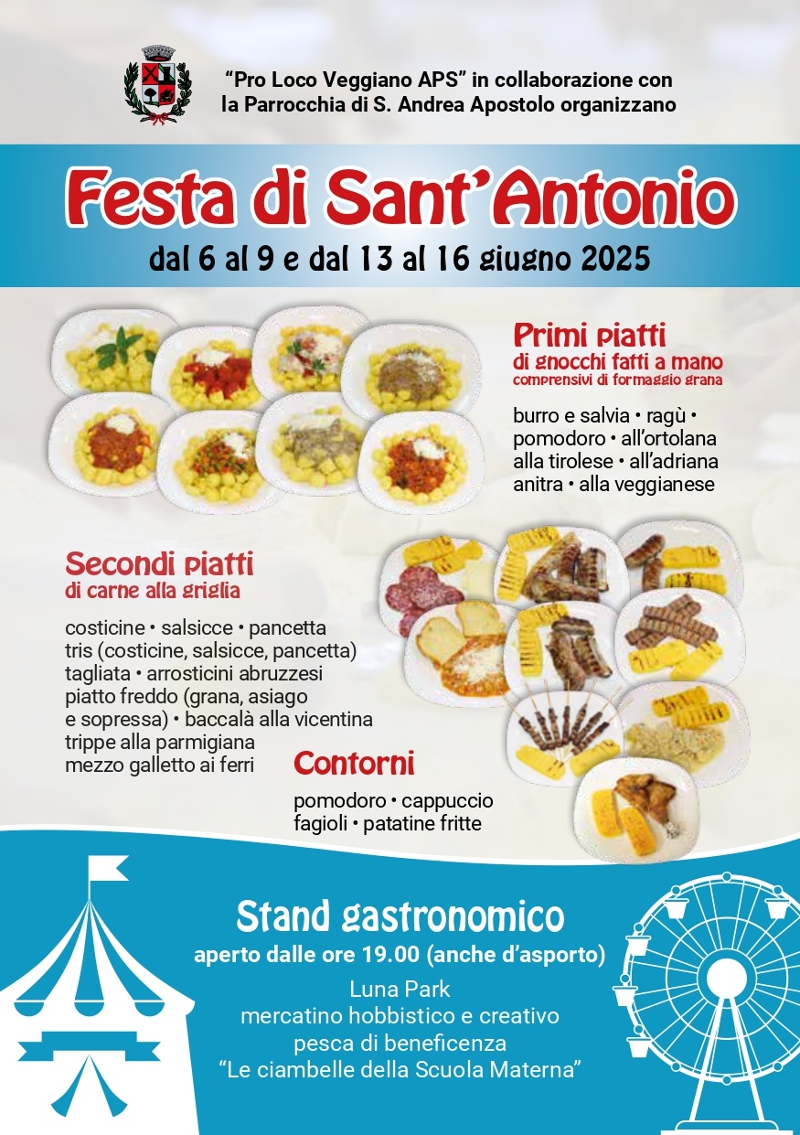Il Santo patrono di Veggiano è Sant'Andrea apostolo e come da tradizione la Sagra parrocchiale, un tempo si teneva in quella ricorrenza, ma la stagione, fine Novembre, non era certo propizia.Così, nei primi anni settanta, si è pensato di organizzare la Sagra parrocchiale nella ricorrenza del festeggiamento del nostro grande Santo Padovano, Sant'Antonio da Padova, il 13 Giugno.